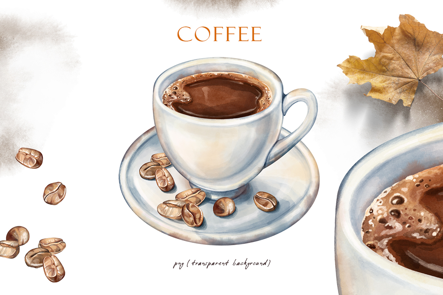 "WATERCOLOR CUP OF BLACK COFFEE & BEANS" collection includes: