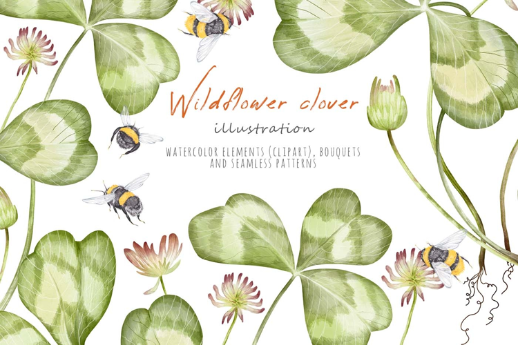 Watercolor wildflower clover and bumblebees. Patrick's day