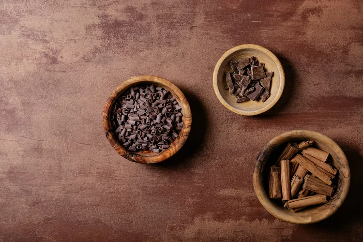 Wooden bowls with chocolate, cinnamon and cacao over brown texture background. Top view, flat lay. Copy space