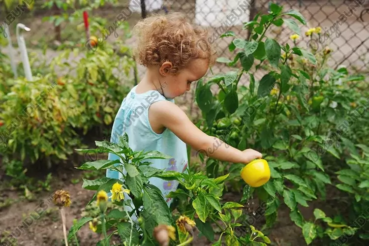 Little girl in dress watering the flowers in the family garden at a summer day, very rural scene