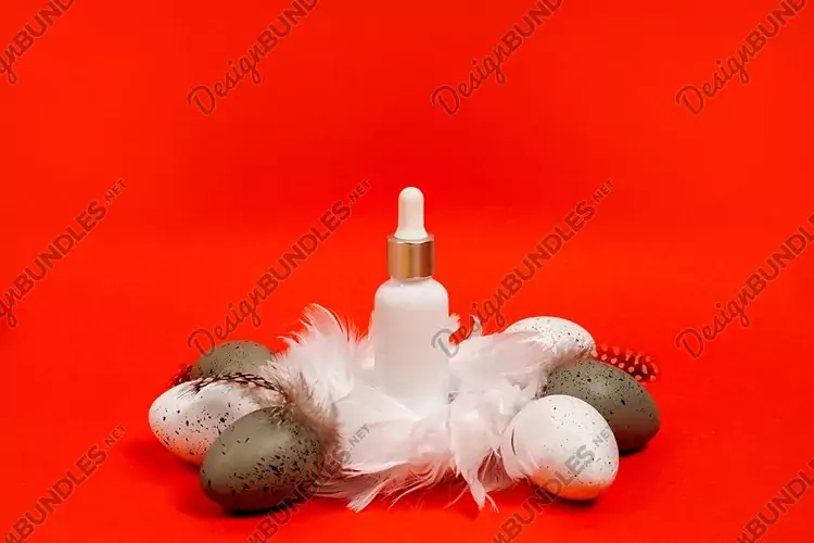 Cosmetic white bottle with essential oil or serum in the nest with easter eggs, bright red backgrund