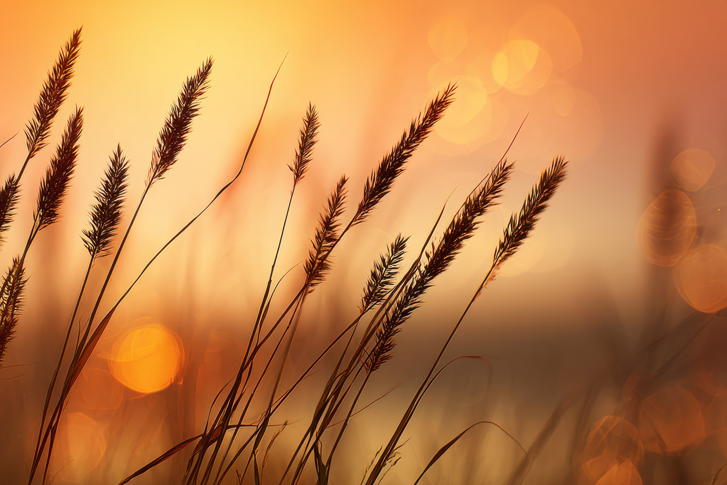 A warm and atmospheric nature background featuring delicate wild grass swaying in soft golden sunset light. Gentle bokeh highlights and earthy tones create a calm, cozy, and timeless mood, perfect for modern interiors and digital design projects.