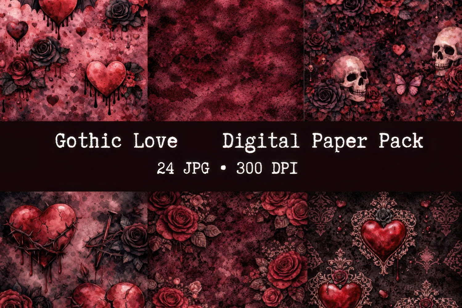 Gothic Love Digital Paper Pack, Dark Romance Grunge Backgrounds, Bloody Hearts Roses Skulls, Gothic Scrapbook Paper, 24 JPG