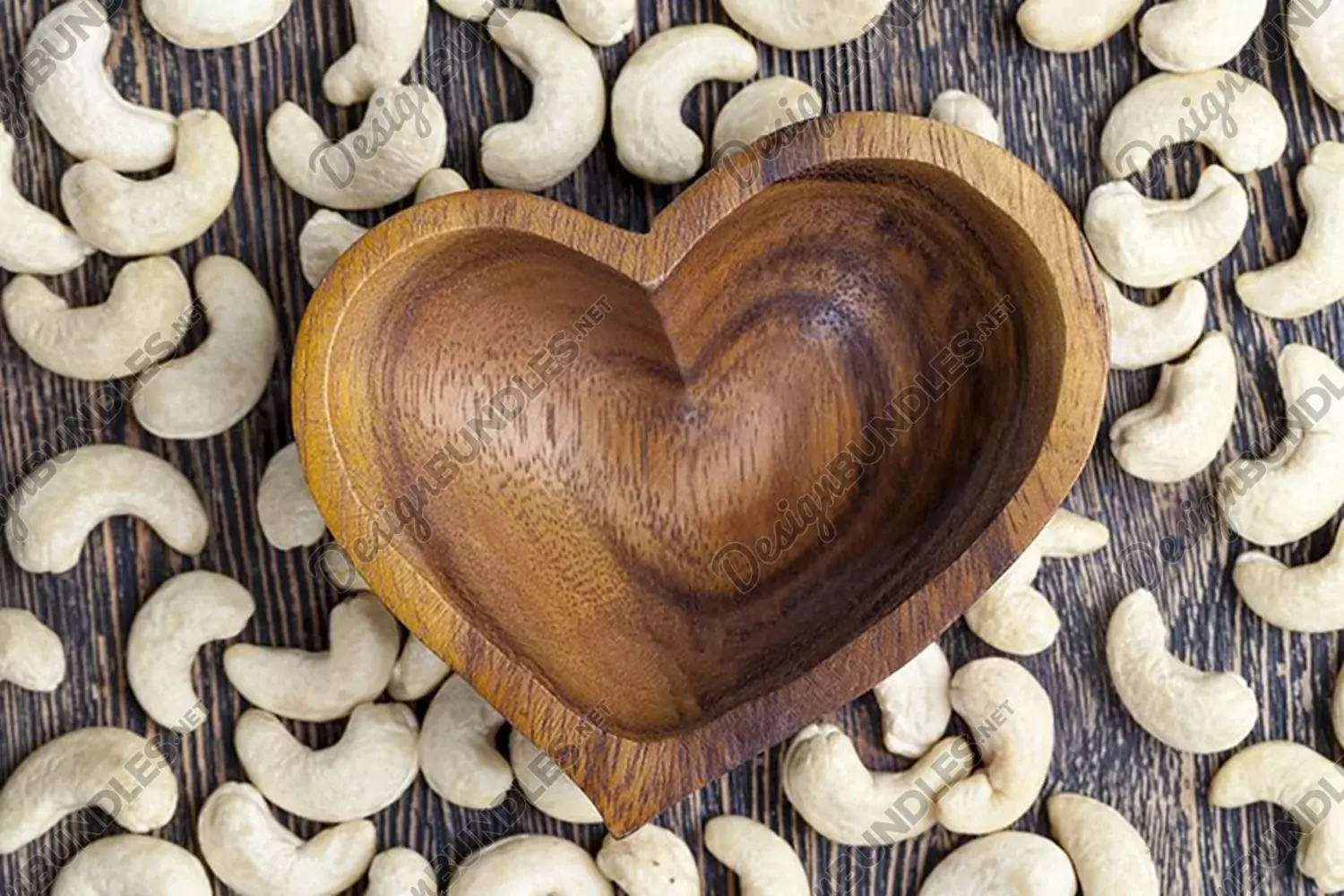 close up of peeled cashews on the kitchen table in a wooden plate, crunchy cashew nuts in a heart shaped bowl, delicious and healthy raw cashew nuts in a heart shaped plate