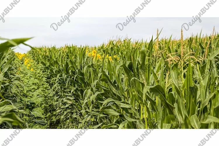 bright sunflower with yellow petals on an agricultural field, of sunflower inflorescences growing together with corn in summer