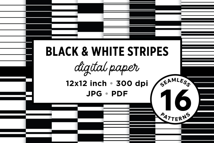 High quality digital paper for use on the web or in print, featuring varying style stripes in black and white. Each pattern is square, 12x12 inches, with 16 seamless patterns total. Save time and money for your design needs! Mix and match as needed.