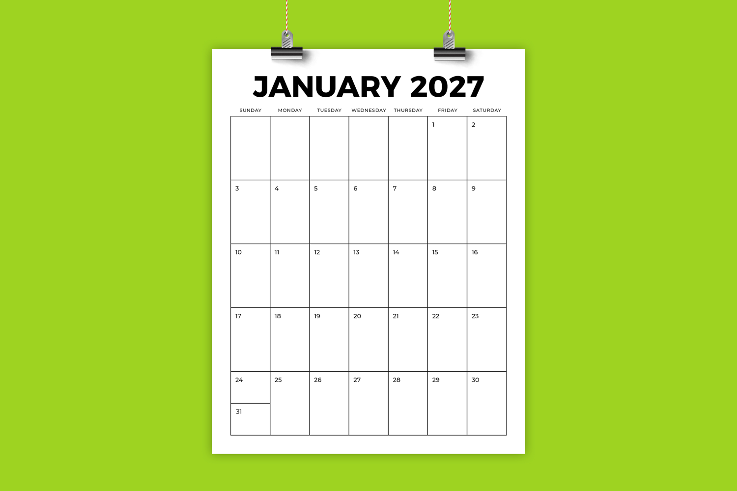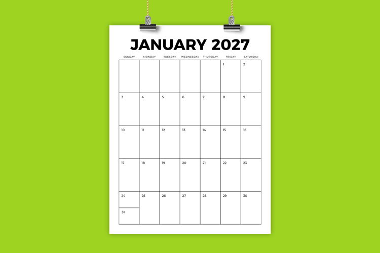 This listing is for a printable 8.5 x 11 inch vertical (portrait orientation) 2027 calendar template. Use as is, or add to it as needed! Perfect for home or office.