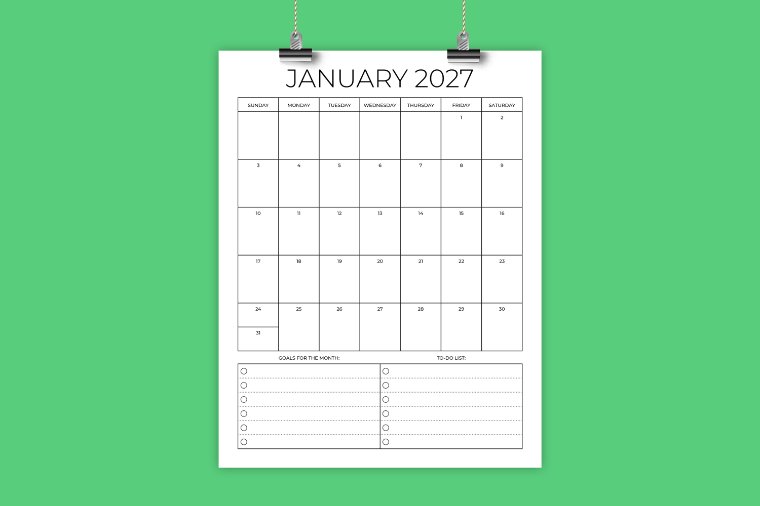 This listing is for a printable 8.5 x 11 inch vertical (portrait orientation) 2027 calendar template. Use as is, or add to it as needed! Perfect for home or office.