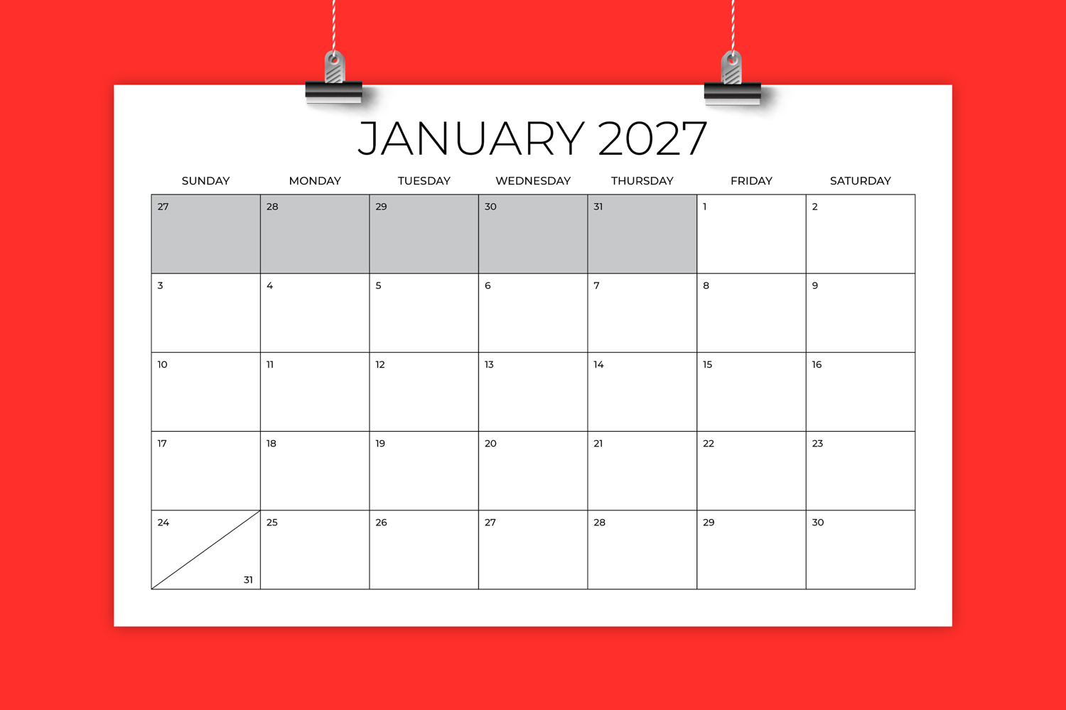 This listing is for a printable 2027 calendar template. Use as is, or add to it as needed! Perfect for home or office.