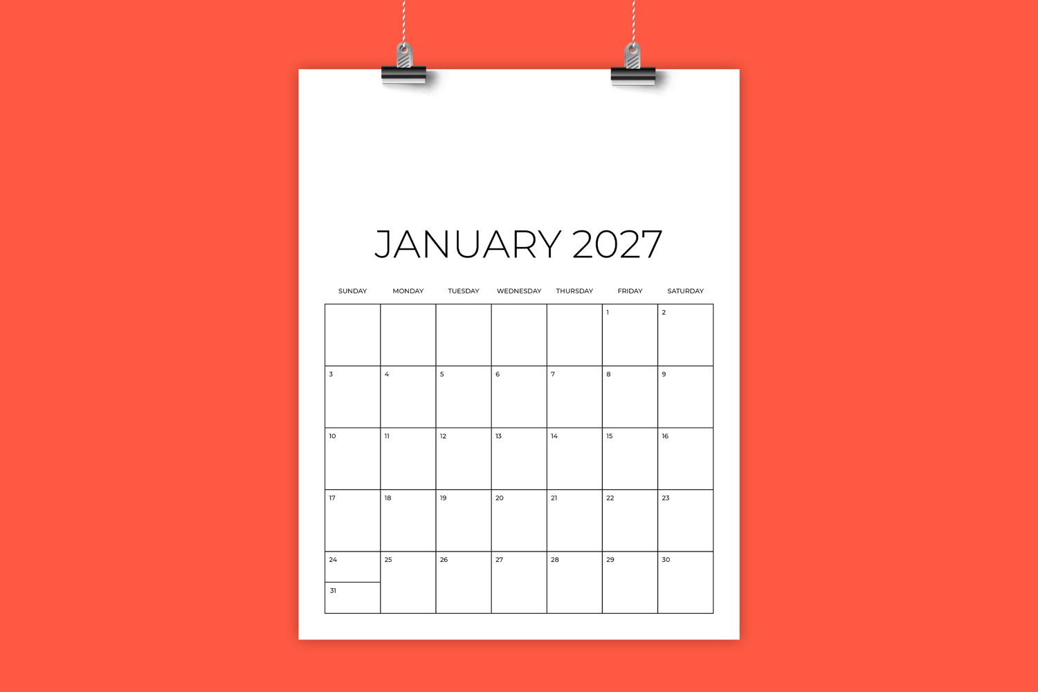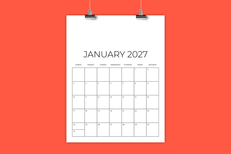 This listing is for a printable 2027 calendar template. Use as is, or add to it as needed! Perfect for home or office.