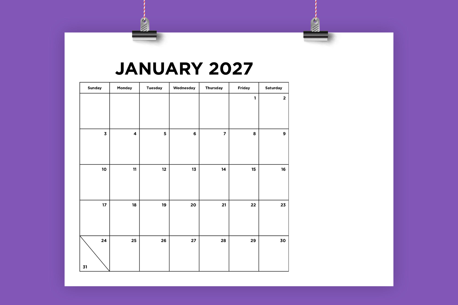 This listing is for a printable 2027 calendar template. Use as is, or add to it as needed! Perfect for home or office.