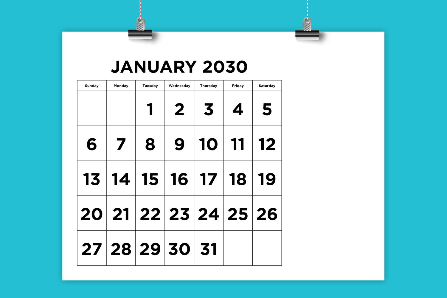 2030 Large Number Bold 8.5 x 11 Inch Calendar Template