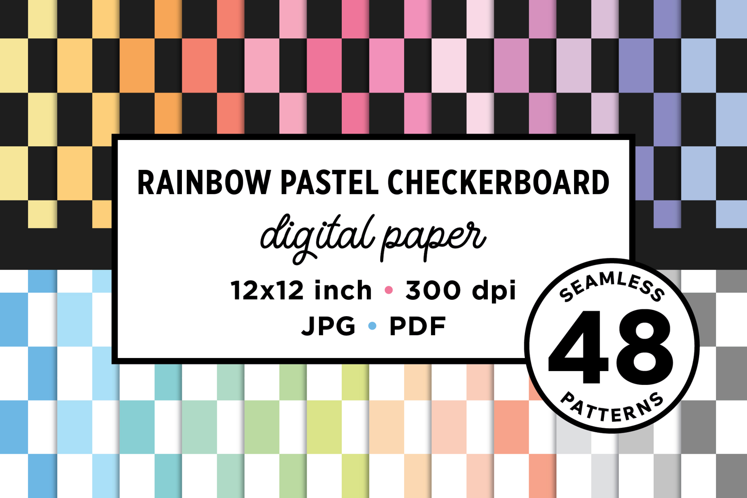 High quality digital paper for use on the web or in print, featuring dark gray and white checkerboard patterns with fun pastel colors and grays. Each pattern is square, 12x12 inches, with 48 seamless patterns total. Save time and money for your design needs.