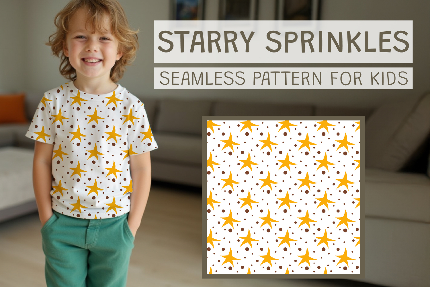 A bold and playful seamless pattern featuring bright yellow stars and scattered brown dots on a clean white background. This simple and cheerful design is perfect for fabric, wrapping paper, scrapbooking, stationery, packaging, sublimation, nursery products, and other creative projects.