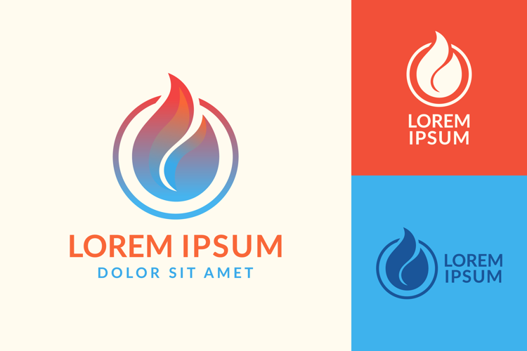 A modern, graphic logo design concept with a stylized flame within a circle, in a variety of color schemes..