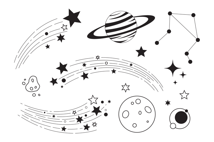 Vector illustration featuring a collection of cosmic elements, including planets, stars, constellations, and meteors, rendered in a clean, doodle style