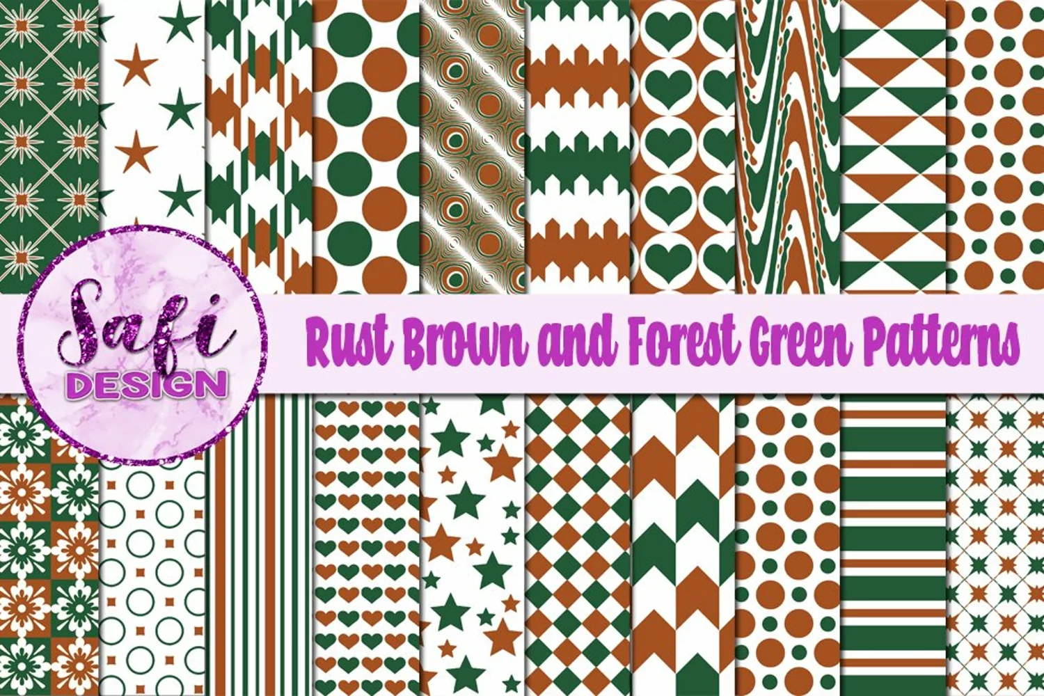 This file contains 20 digital papers featuring patterns in rust brown, forest green and white.