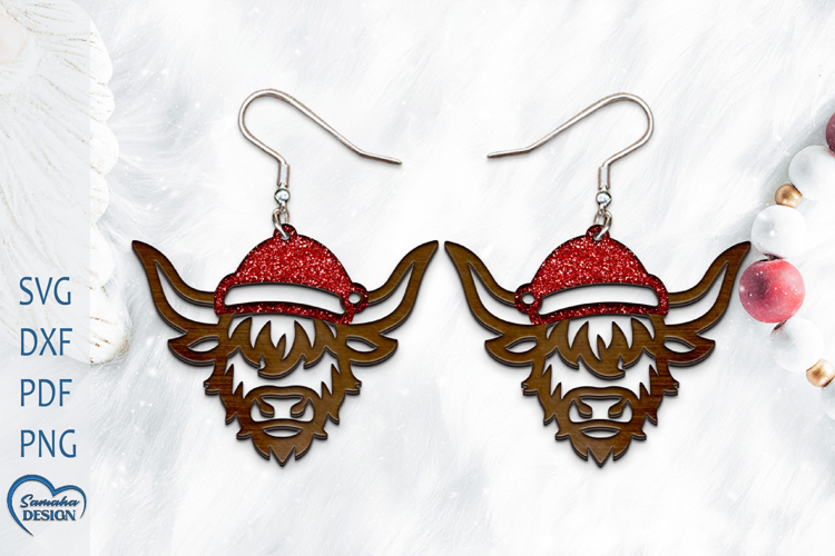 Christmas Earrings Laser Cut. Christmas Highland Cow Laser.