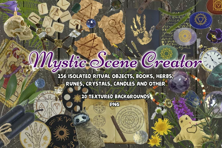 Happy to introduce the Big Mystic Scene Creator that includes huge collection of mysterious ritual objects like witch books of spells, magic crystalls, candles, herbs, voodoo dolls and many others.