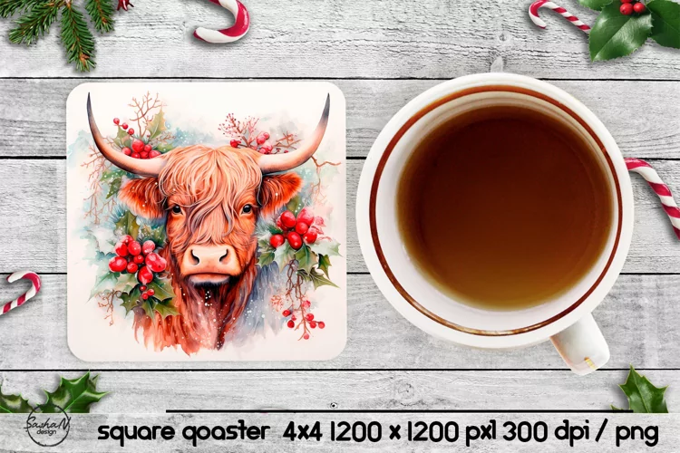 Watercolor Christmas Christmas Sublimation Square Coasters Coaster Design Christmas Horse Sublimation Coaster Sublimation Christmas Highland Cow Christmas Highland Cow Sublimation Highland Cow Watercolor Square Coasters Sublimation Designs
