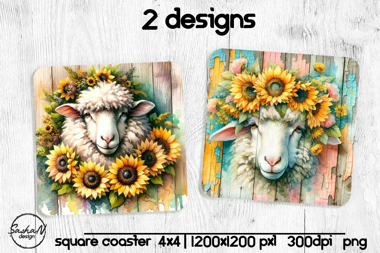 Watercolor sheep with sunflowers square coaster sublimation example image 1