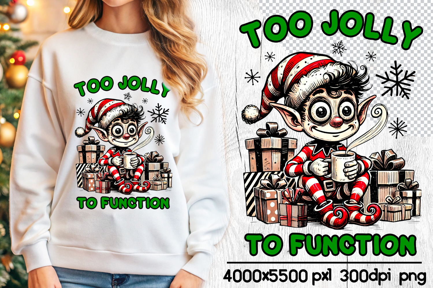 This upbeat, slightly unhinged holiday graphic features a wide-eyed elf in candy-cane stripes, clutching a steaming cup of cocoa and sitting among stacked presents with the phrase “Too Jolly to Function.” The lively hand-drawn lines and poppy festive palette bring instant energy to winter projects—great when your make needs over-the-top cheer with a wink. Drop it into cards, labels, apparel, or party décor for a playful, caffeine-fueled vibe that still reads clearly at both small and large sizes.