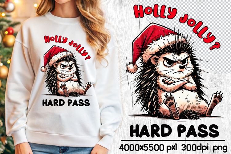 This prickly-cute holiday graphic features a cross-armed hedgehog in a Santa hat with the line “Holly Jolly? Hard Pass.” The sketchy hand-drawn style and bold expression bring instant attitude to seasonal makes—great for projects that need adorable woodland charm with a snarky twist. Drop it into cards, labels, apparel, or gift décor when you want a quick laugh without visual clutter.