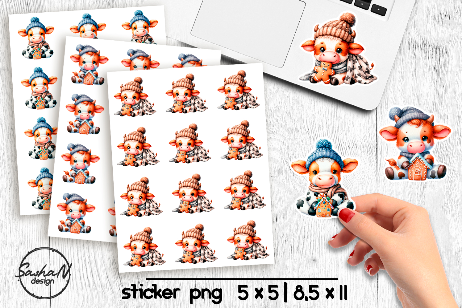 Cute Christmas cow stickers, winter animals stickers example image 1
