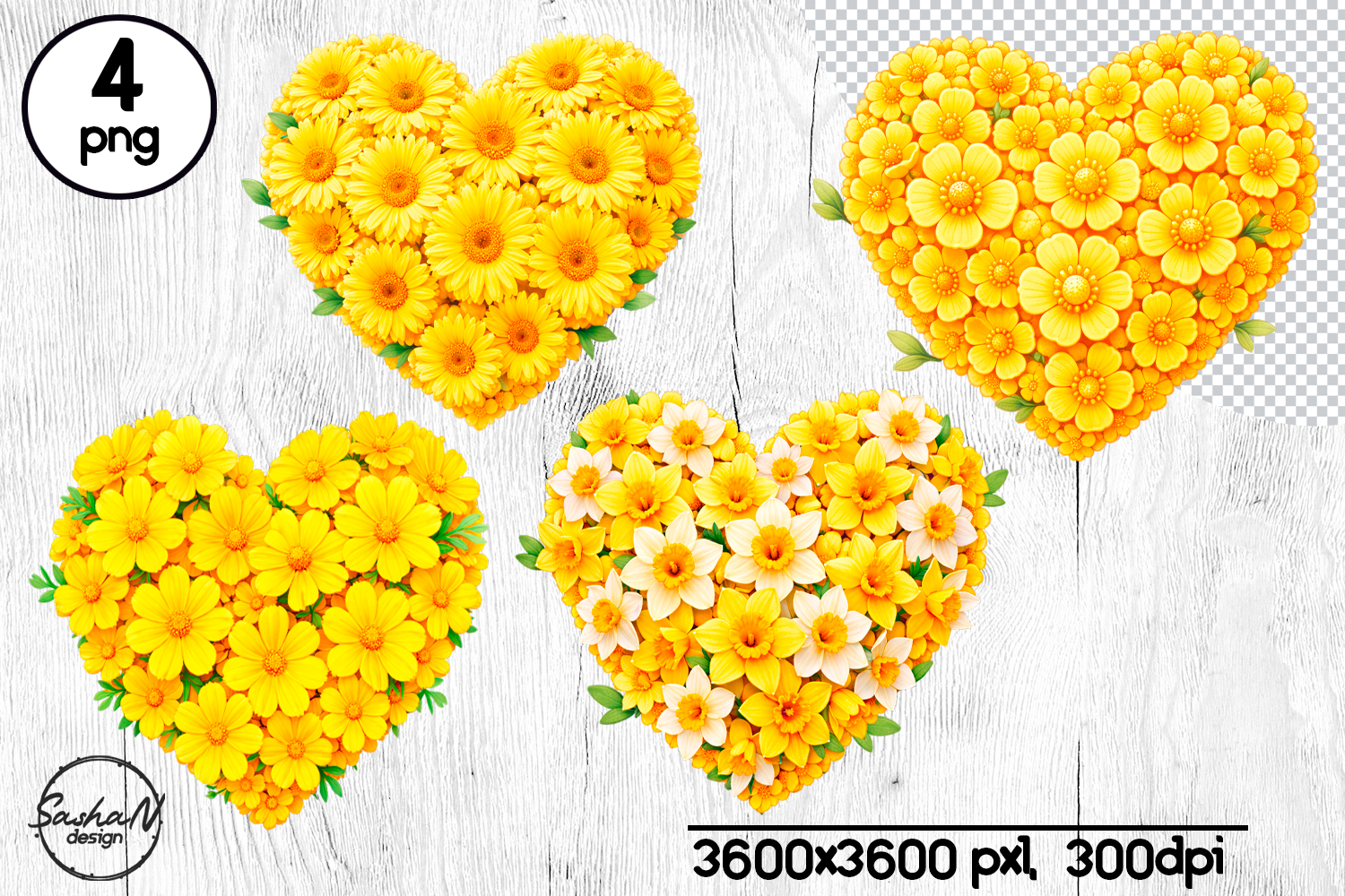 A bright yellow floral heart clipart set featuring four heart-shaped arrangements made of cheerful spring flowers. Perfect for Valentine’s Day designs, wedding projects, cards, sublimation, stickers, prints, and digital crafts. High-quality PNG files with transparent background, ready to use.