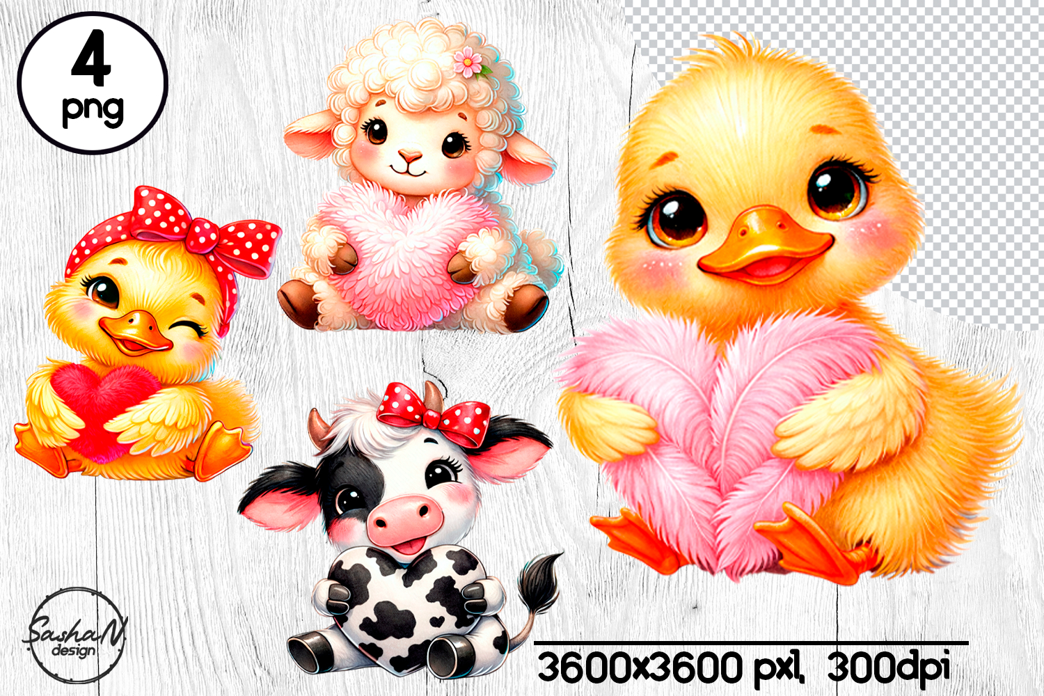 This adorable Valentine clipart set features cute farm animals holding hearts, illustrated in a soft, playful style that’s perfect for love-themed projects.