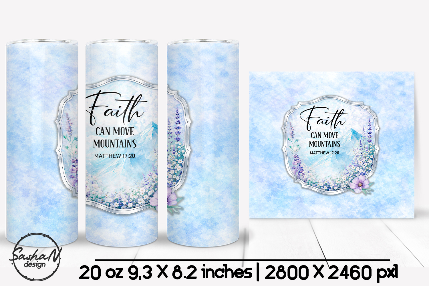 Inspirational Christian sublimation design featuring a soft blue watercolor background, delicate florals, and a peaceful mountain scene with the uplifting Bible verse “Faith Can Move Mountains” – Matthew 17:20. This timeless faith-based design evokes hope, strength, and trust, making it perfect for meaningful gifts, inspirational drinkware, and Christian creative projects.