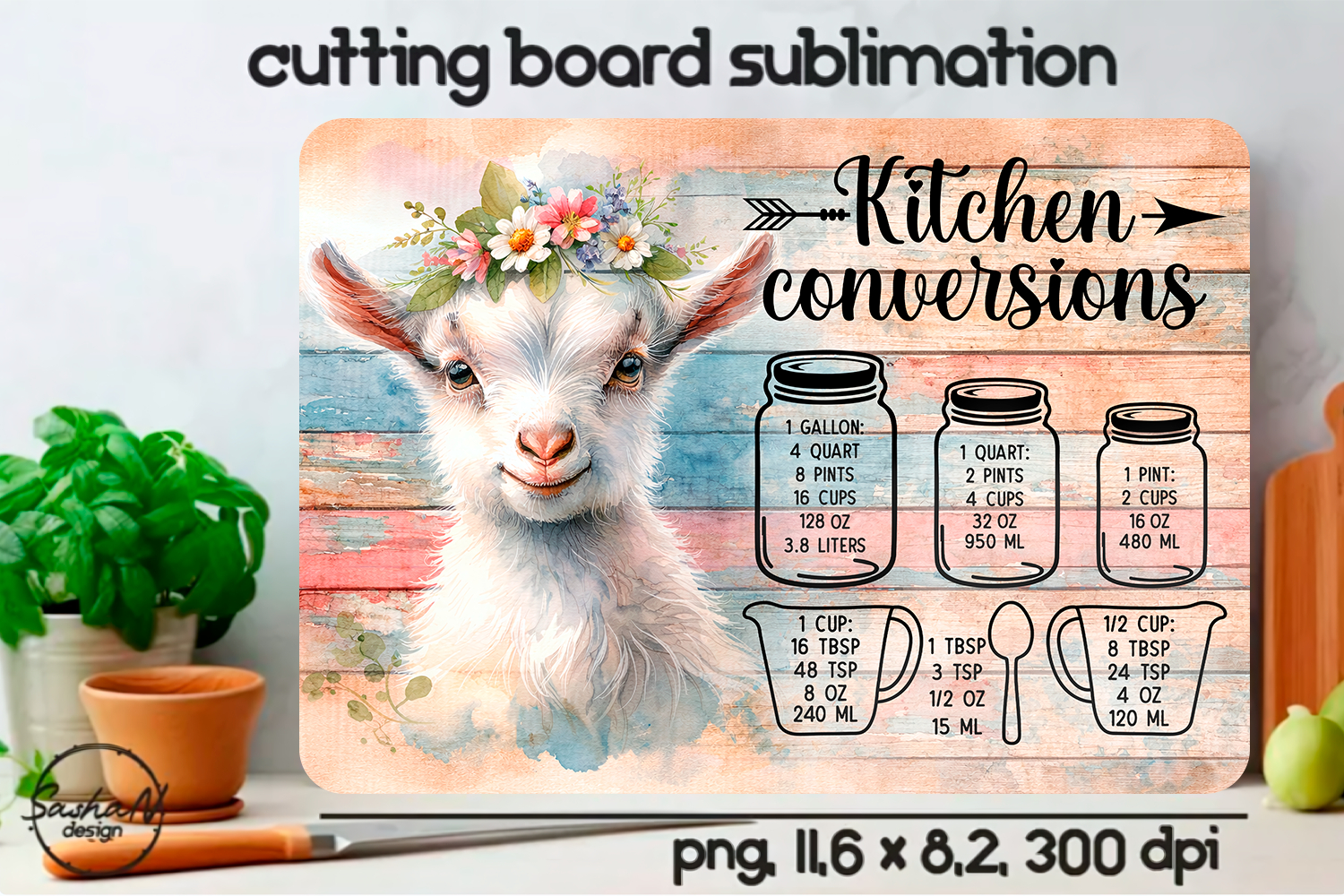 Add rustic charm and practical beauty to your kitchen with this farmhouse-style cutting board sublimation design. This high-resolution PNG features a beautifully illustrated farm animal with a floral crown, paired with clear kitchen conversion and cooking temperature guides — decorative and functional in one design.