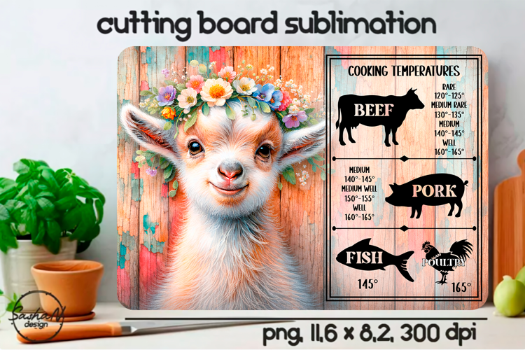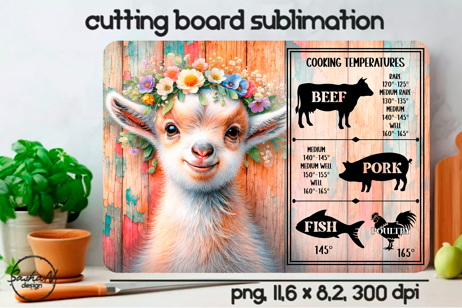 Add rustic charm and practical beauty to your kitchen with this farmhouse-style cutting board sublimation design. This high-resolution PNG features a beautifully illustrated farm animal with a floral crown, paired with clear kitchen conversion and cooking temperature guides — decorative and functional in one design.