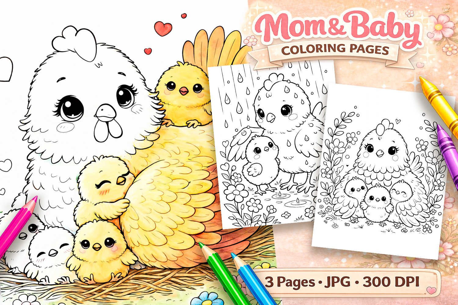 Cute animals Mothers day coloring pages, Cute chickens