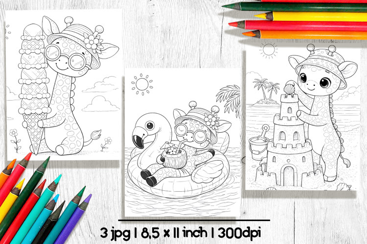 This cute coloring pages set features cute Giraffe enjoying summer days in fun and playful scenes. Perfect for kids who love sweet characters and relaxing coloring pages.