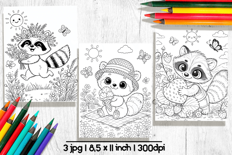 This cute coloring pages set features cute raccoon enjoying summer days in fun and playful scenes. Perfect for kids who love sweet characters and relaxing coloring pages.