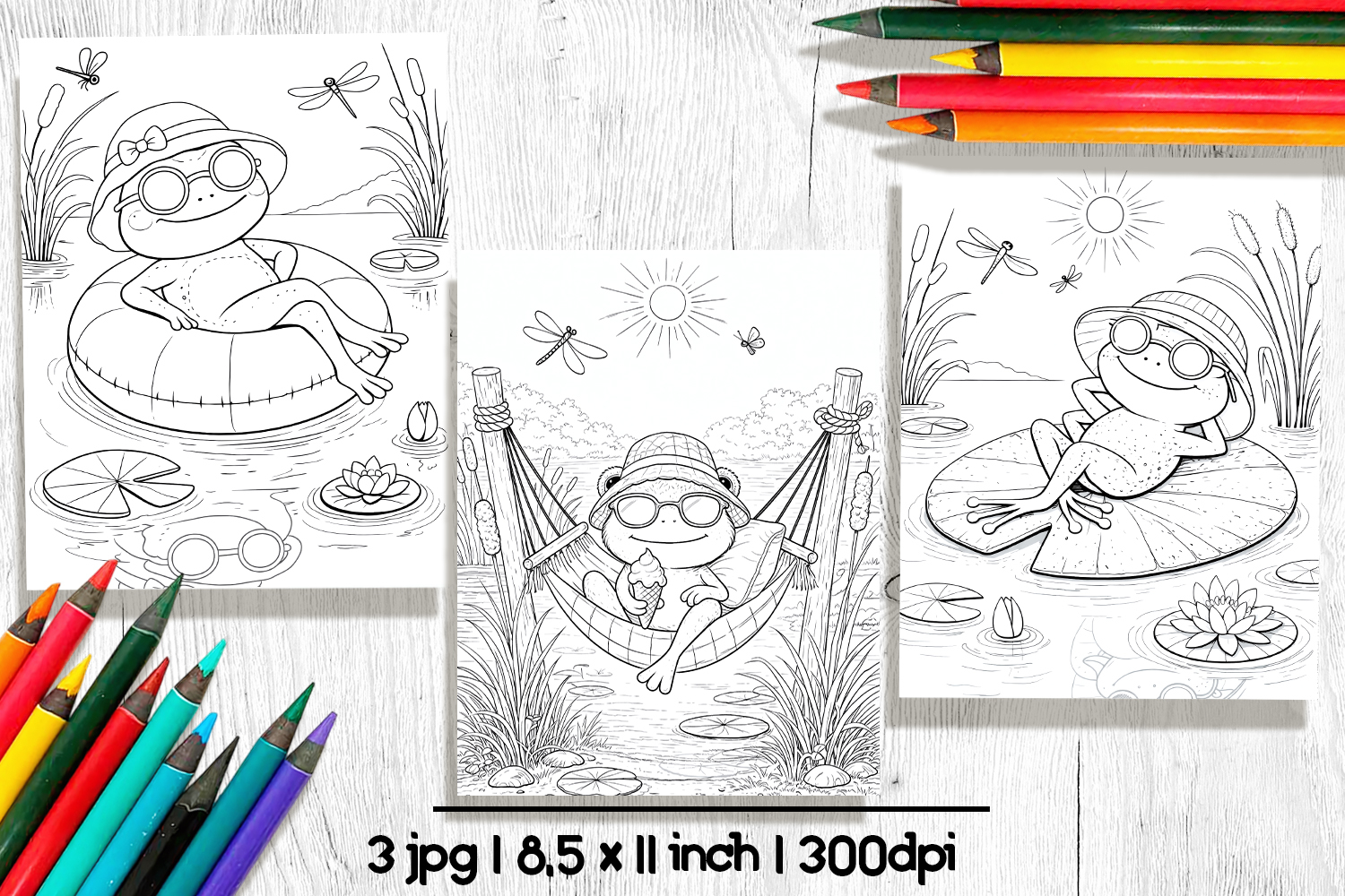 This cute coloring pages set features cute frog enjoying summer days in fun and playful scenes. Perfect for kids who love sweet characters and relaxing coloring pages.