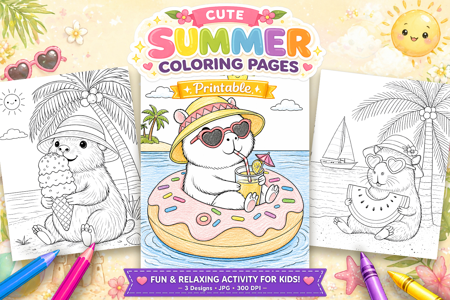 Coloring Book Cute Animals Coloring Pages Summer Beach Clipart Capybara Coloring Pages For Kids Summer Coloring Pages Printable Coloring Sheets Activity Page Animal Coloring Pages For Kids