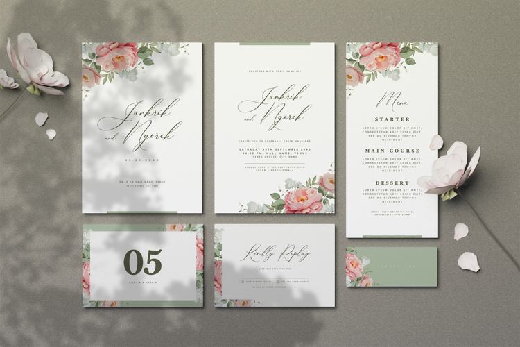wedding card invitation set with beautiful peonies flower