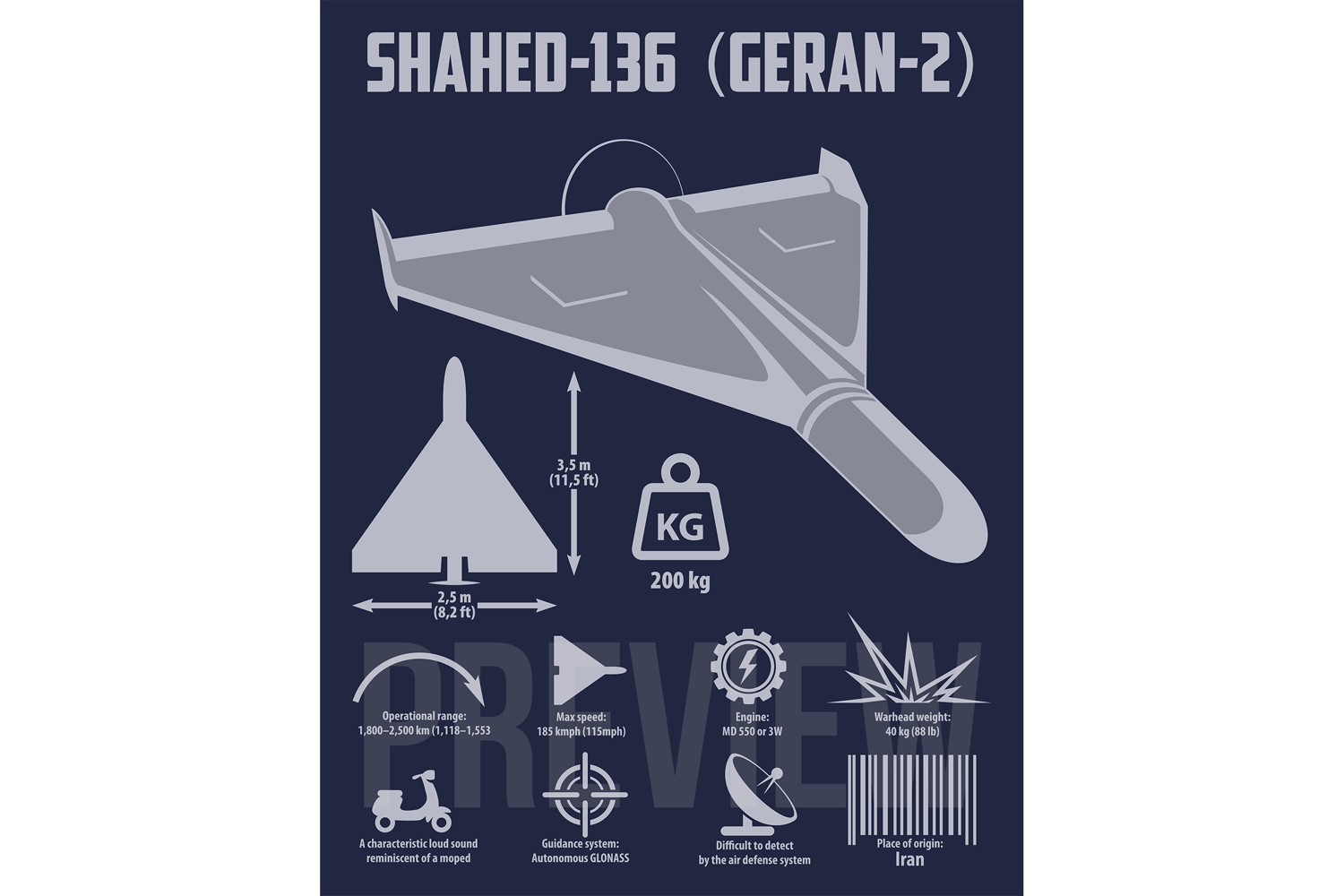 Shahed-136 Drone Infographic | Flat Vector Military Illustration | Educational Digital Download
