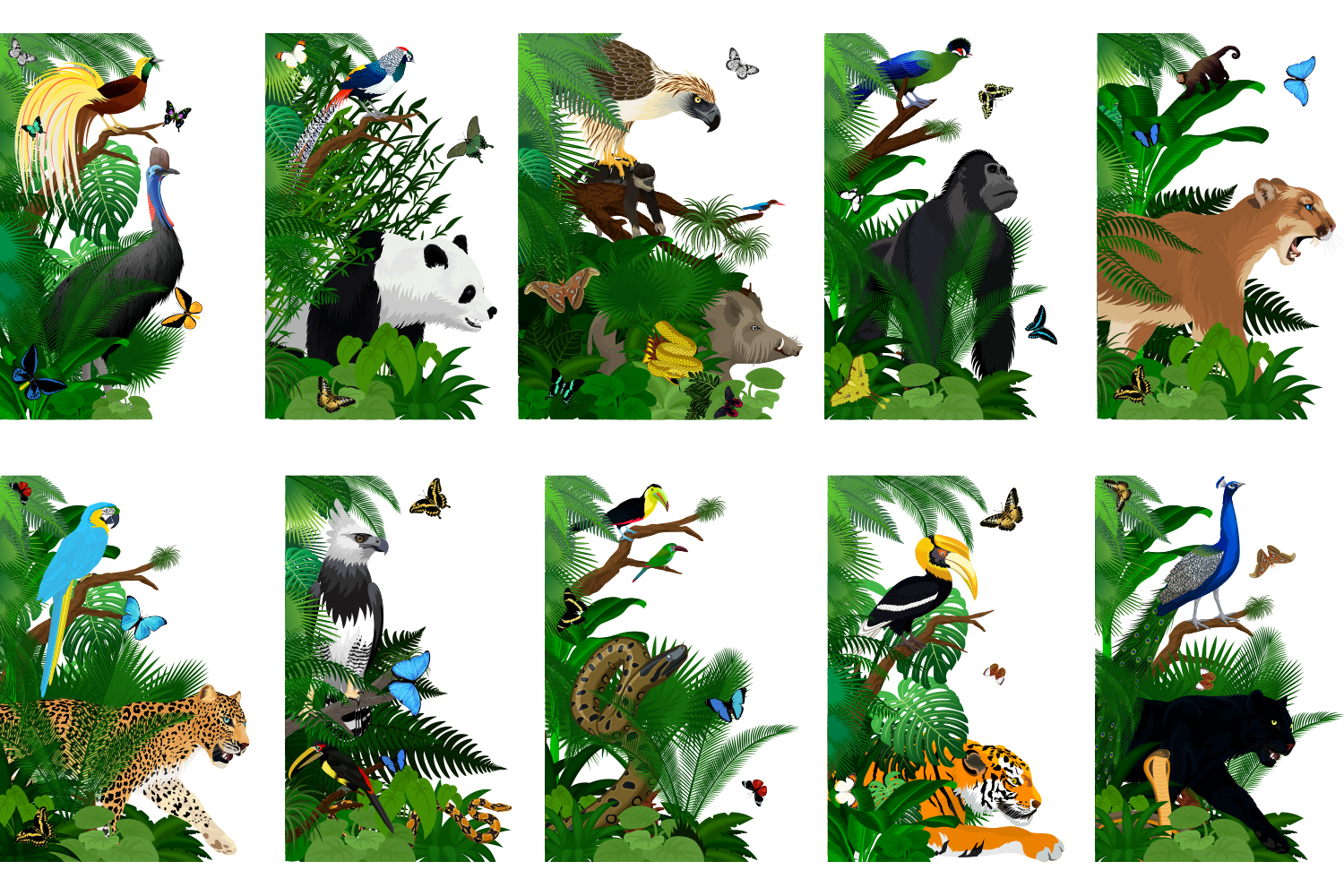 Mega set of 10 detailised Vector Jungle Rainforest corner & border with different animals: