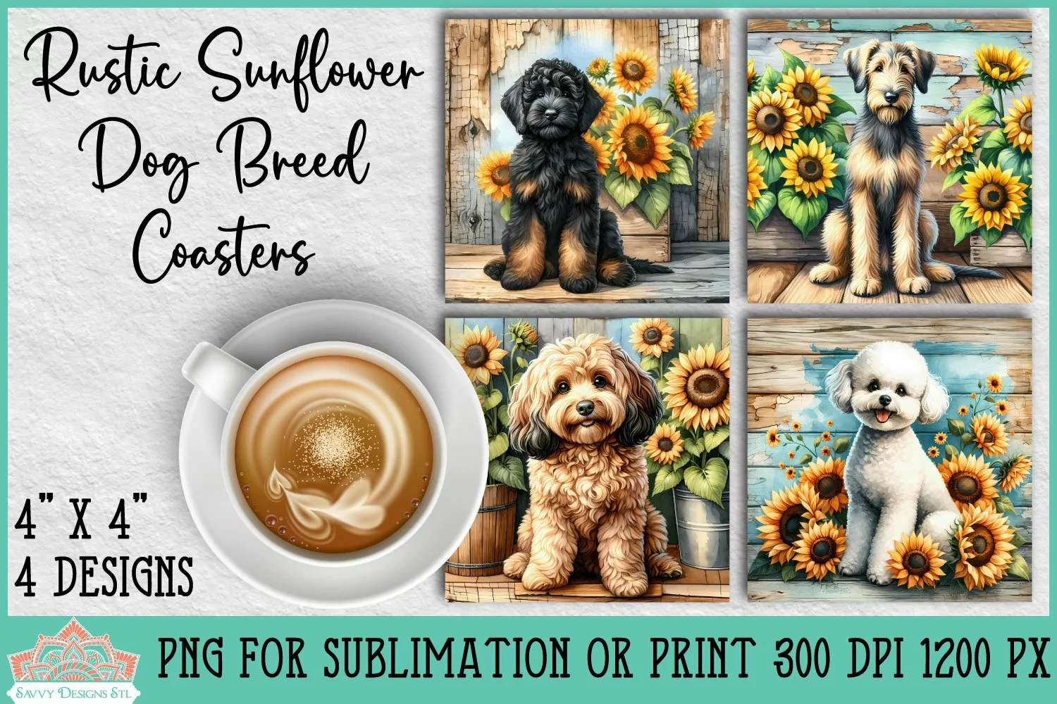 Dog Breed Coaster Sublimation | Rustic Sunflowers, 4 Designs, 300dpi, 4"x4"