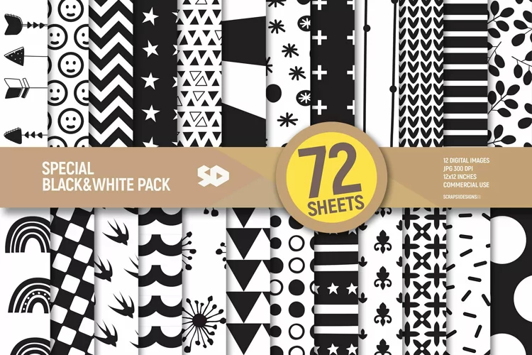 This is a 72 black and white digital paper pack for every creative project imaginable like scrapbooking, parties, blog design, stickers, invites, greeting cards and much more.