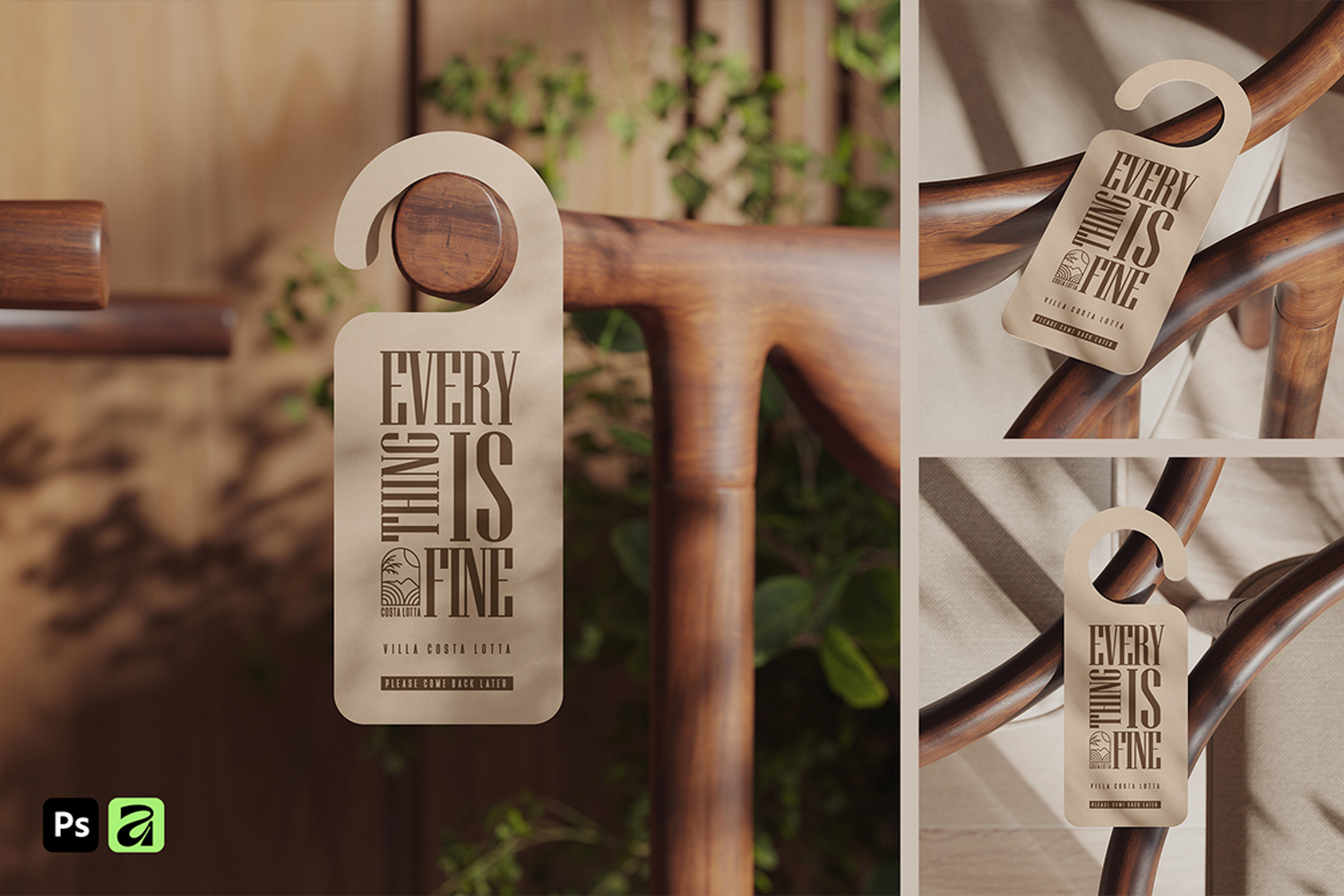 High-quality door hanger mockup placed on a wooden chair armrest. Perfect for showcasing branding, hotel signage, and print design with a realistic, elegant presentation.