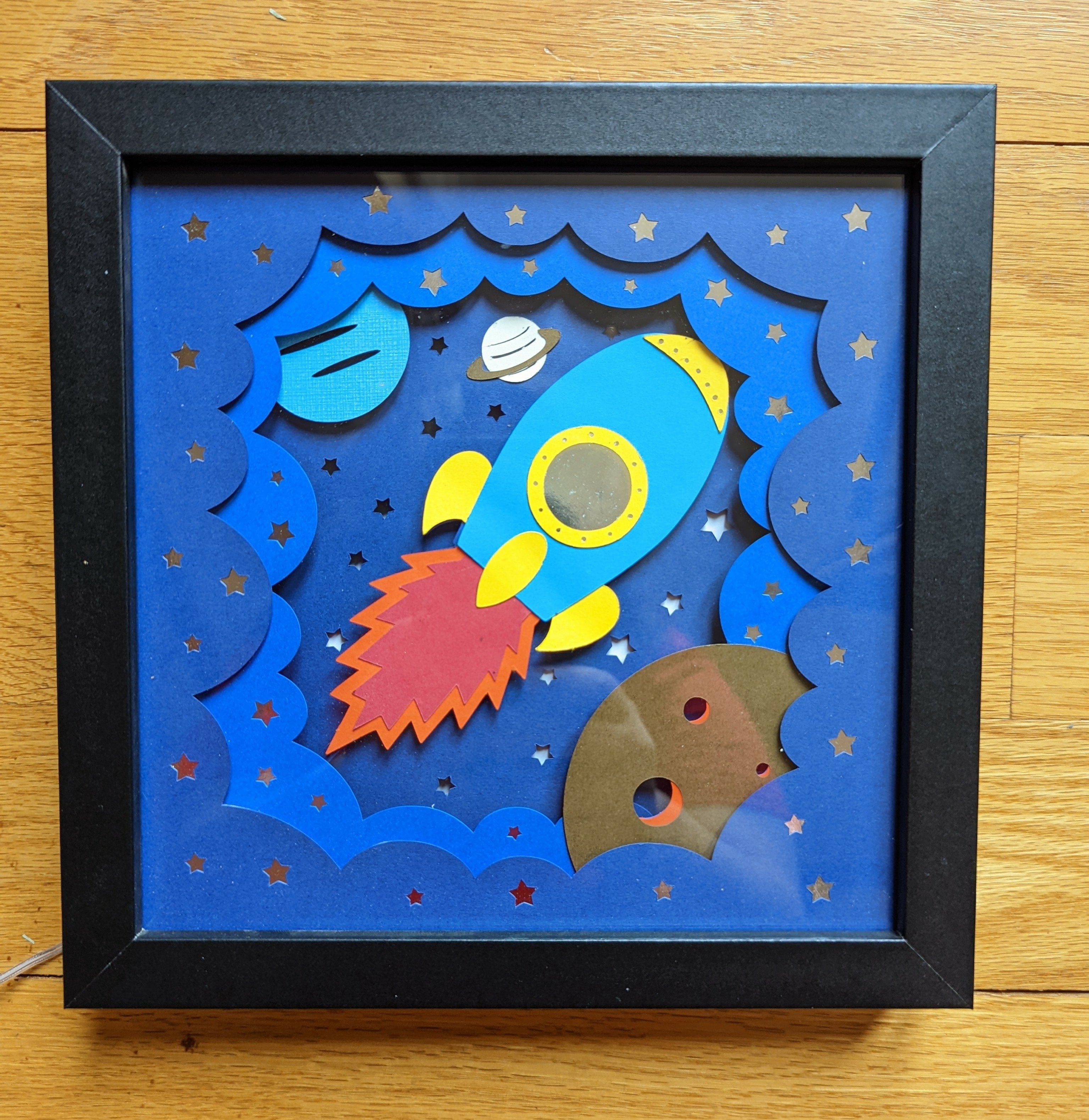 A rocket ship shadow box 3D paper cut template. This colourful rocket ship is zooming through outer space past planets and stars. This shadow box design looks great as decor in a child’s space-themed bedroom. The shadow box is designed to have micro LED lights at the back so they make the background stars shine. However it will look great without the lights too.