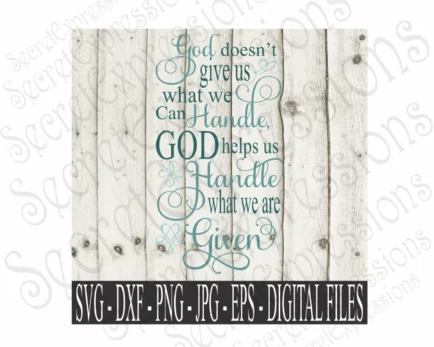 "God doesn't give us what we can handle, God helps us handle what we are given" Digital File. Use this file with your Cricut Explore or Silhouette Cameo to create a wood sign stencil or vinyl decal. PNG & JPG files are great for making framed clip art.
