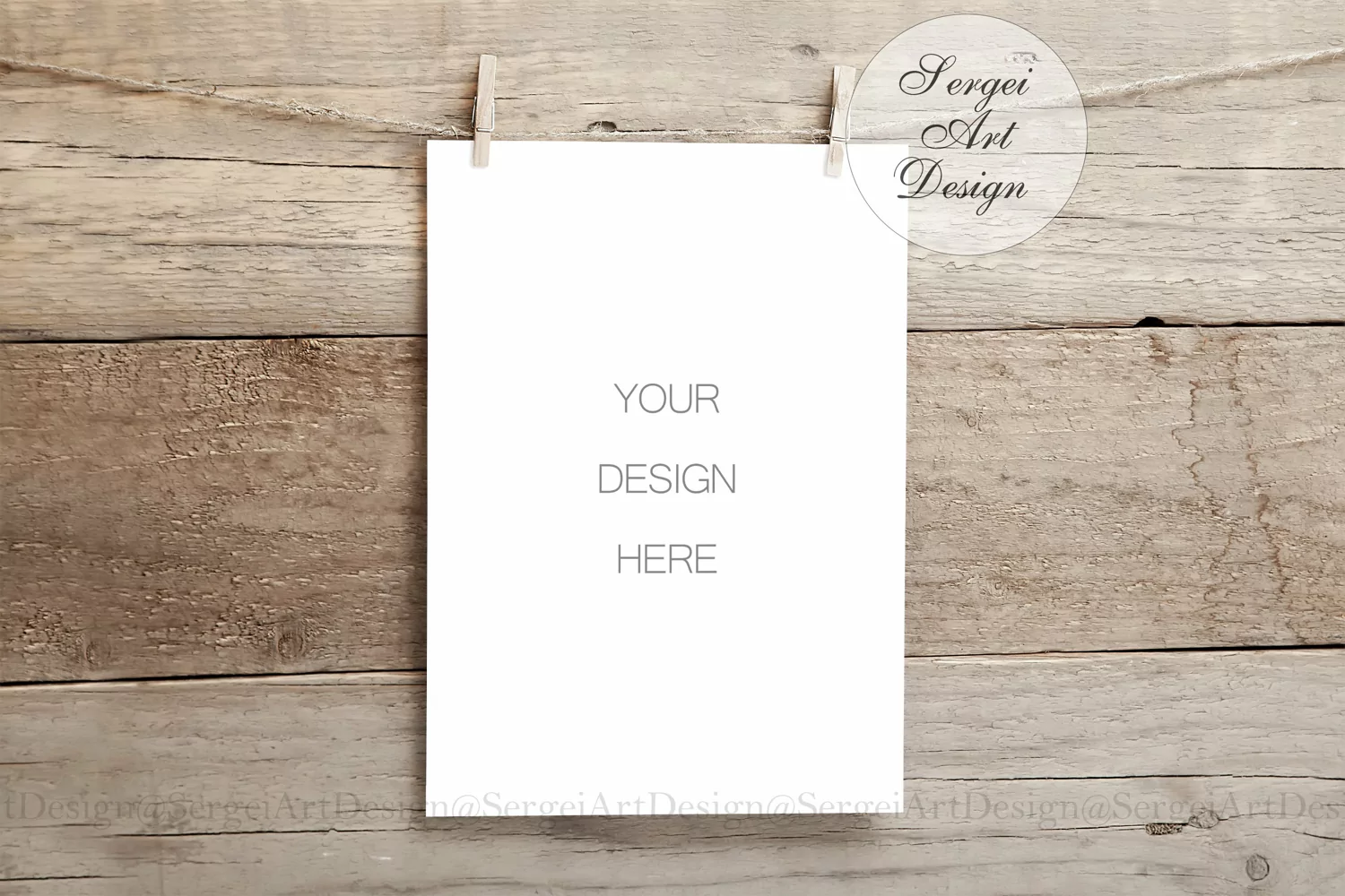 This stylish A4 (also suitable for 5x7 cards) sheet mock up on a clothesline is perfect for showing your prints, posters or other artwork.