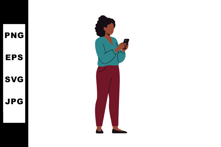 Woman with curly hair stands using smartphone wearing a blue top and red pants in a simple flat style calm mood.