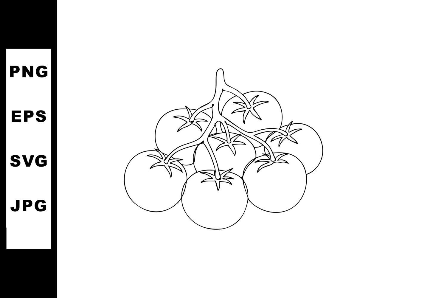 Illustration shows a branch with seven ripe round tomatoes connected by stems in a clear, simple line art style, conveying freshness and naturalness.