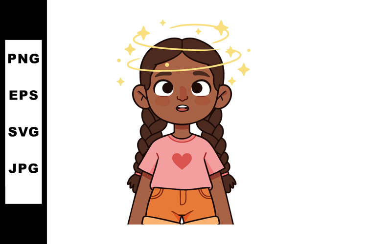 Illustration of a young girl with brown skin and braids appearing dizzy with yellow stars and halos above her head, conveying confusion and surprise mood.